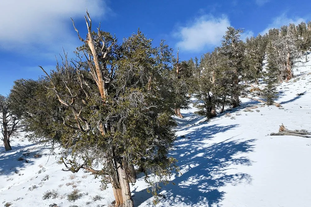 A Bristlecone Pine in the snow in Methuselah Grove